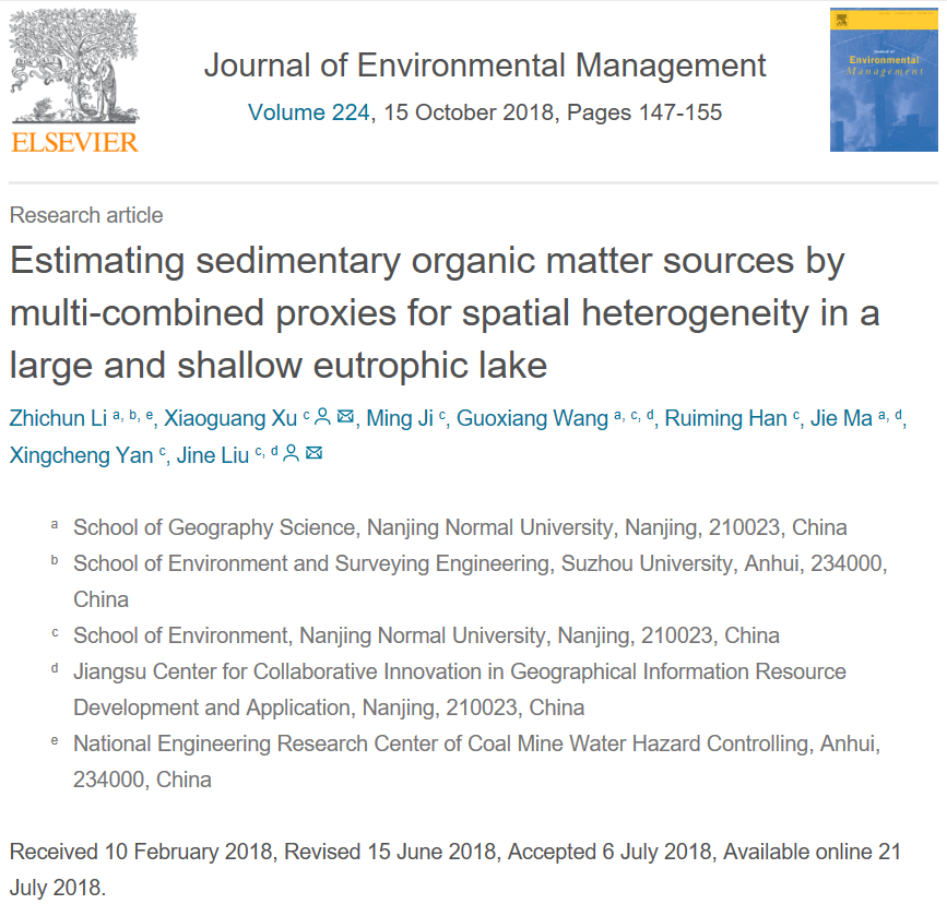 威尼斯官网在读博士李致春老师在大型浅水富营养化湖泊沉积物有机碳来源识别方面研究取得进展。相关成果以“Estimating sedimentary organic matter sources by multi-combined proxies for spatial heterogeneity in a large and shallow eutrophic lake” 为题,发表在环境污染与评价管理研究方向国际主流期刊《Journal of Environmental Management》(中科院环境科学与生态学学科SCI期刊分区2区,汤森路透JCR分区Q1区,IF=4.005)上。该文章李致春老师为第一作者,我校为第二发表单位。