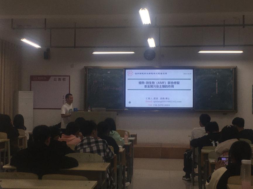 2023年10月15日,裘浪博士在实习实训楼A507做题为“植物-微生物(AMF)联合修复重金属污染土壤的作用”的学术报告,23级环境工程专业70名学生参加了此次讲座。