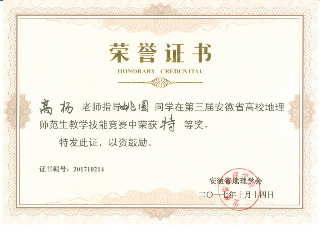 高杨老师指导姚圆同学在第三届安徽省高校地理师范生教学技能竞赛中荣获特等奖