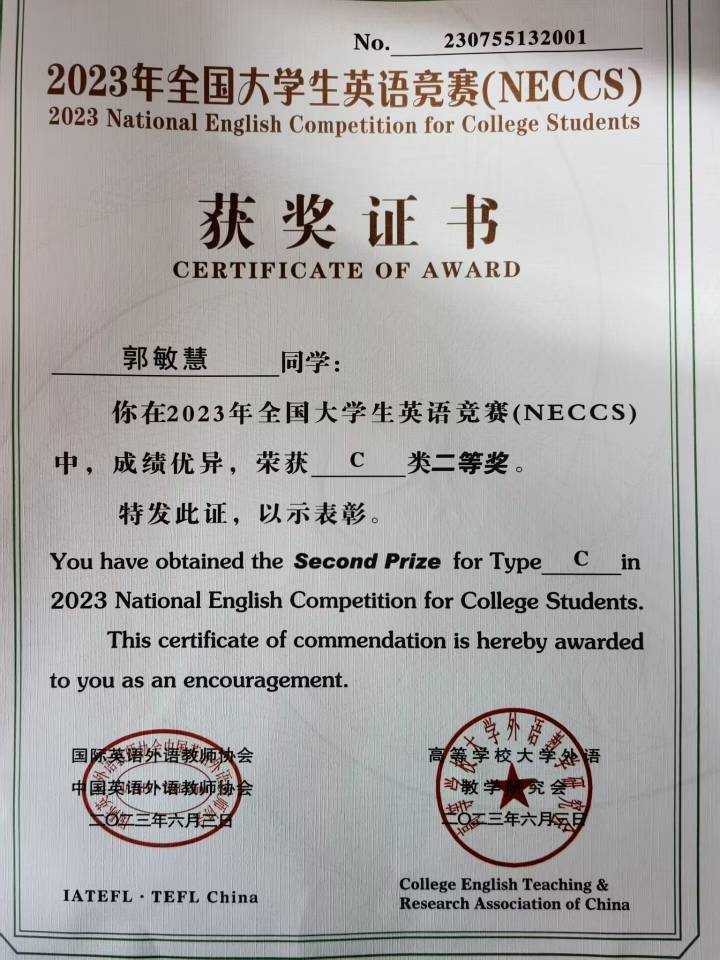 2023年全国大学生英语竞赛(NECCS)C类二等奖